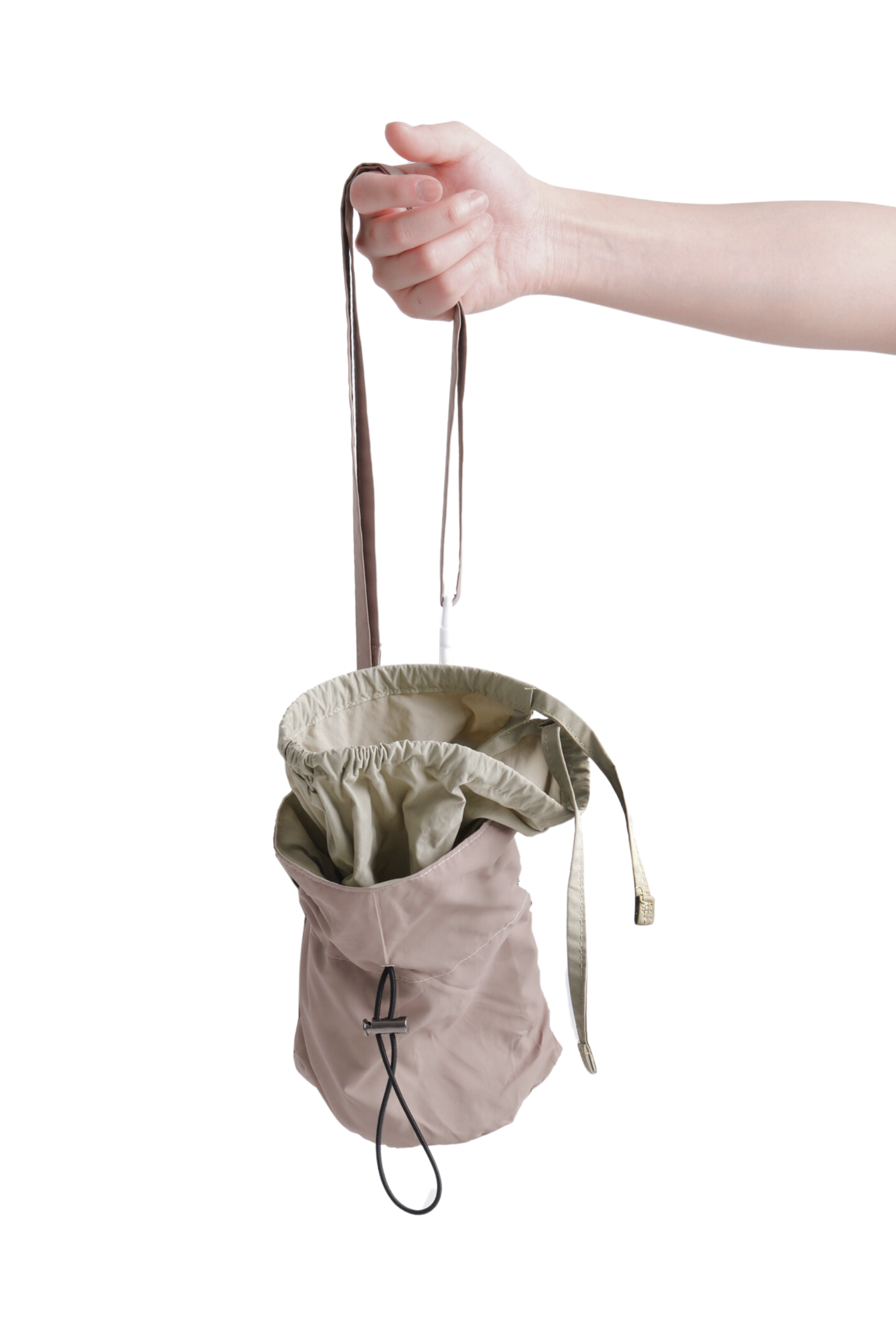 Love this bag! I stash my climbing harness and shoes in here, and keep my chalk in the detachable chalk bag. To my eyes it appears pale pink in the photo, but it is khaki in person!